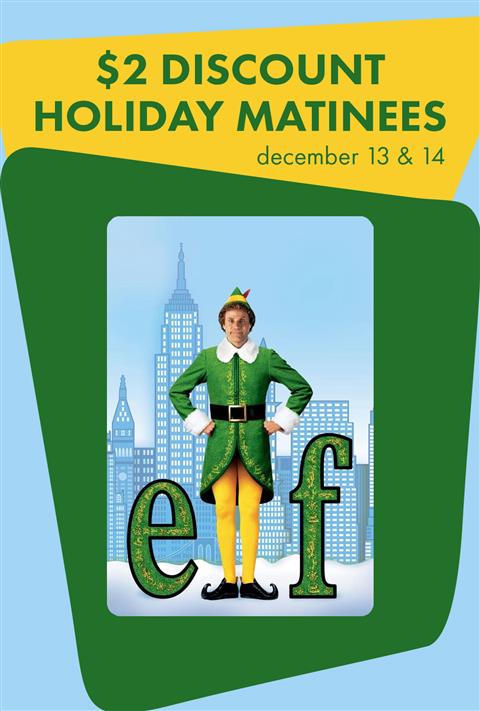 Join us December 13 and 14 for $2 matinees of the beloved 2003 holiday film, ELF, starring Will Ferrell, James Caan, Bob Newhart, and Zooey Deschanel. Raised as an oversized elf, Buddy travels from the North Pole to New York City to meet his biological father, Walter Hobbs, who doesn't know he exists and is in desperate need of some Christmas spirit.